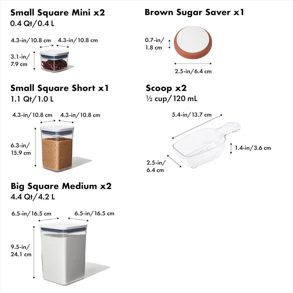 • Set includes: 5 POP Containers: (2) 0.4 Qt, (1) 1.1. Qt and (2) 4.4 Qt; 3 POP Accessories: (2) ½ cup Scoops, (1) Brown Sugar Saver