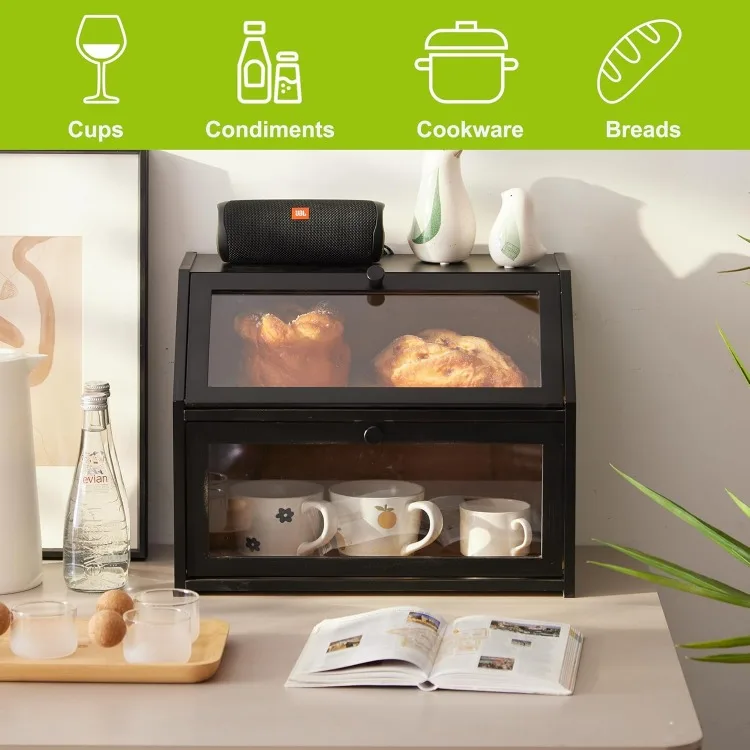 Double Bread Box:Large capacity to hold two loaves of bread as well as rolls, muffins and other baked goods. It can also store fruits, spices, cutlery and other kitchen utensils